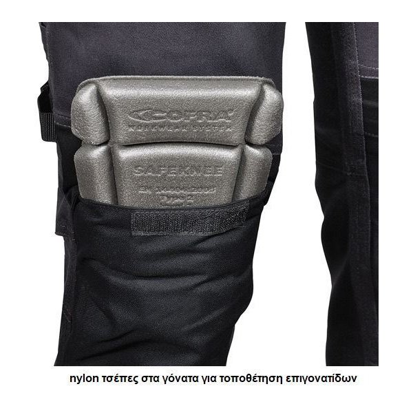 Είναι εξοπλισμένο με 2 φαρδιές μπροστινές τσέπες, διπλή πίσω τσέπη με κλείσιμο με κλαπέτο, ύφασμα με υψηλή ελαστική ικανότητα, θήκη για σφυρί, εργονομικό σχεδιασμό για το γόνατο και το πόδι, τσέπες νάυλον στα γόνατα για επιγονατίδες, εξωτερικές τσέπες νάυλον αποσπώμενες με φερμουάρ, τσέπη μέτρου, θηλιές για εργαλεία, πλαϊνή τσέπη με διπλό άνοιγμα (με κλείσιμο τύπου velcro και φερμουάρ).