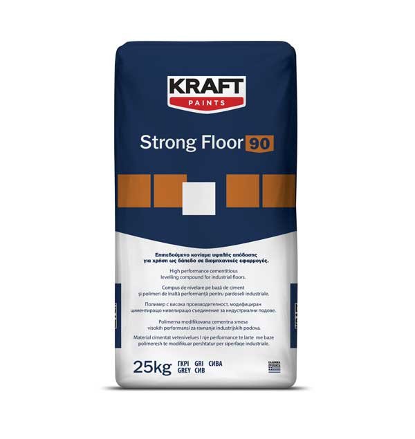 Το KRAFT Strong Floor 90 είναι ενός συστατικού υψηλής ρευστότητας επιπεδούμενο τσιμεντοειδές κονίαμα, τροποποιημένο με πολυμερή, κατάλληλο για χρήση ως δάπεδο σε βιομηχανικά κτήρια, σε δάπεδα υψηλής καταπόνησης (π.χ. χώροι στάθμευσης κλπ) και σε χώρους αστικού περιβάλλοντος (π.χ. πεζοδρόμια, ποδηλατόδρομοι κλπ). Επίσης, είναι κατάλληλο για χυτεύσεις και αγκυρώσεις. Μπορεί να εφαρμοστεί με το χέρι ή με αντλία για εξομάλυνση και επιπέδωση εσωτερικών και εξωτερικών δαπέδων σε πάχος 10-80mm. Λόγω του πολύ χαμηλού πορώδους μπορεί να χρησιμοποιηθεί ως τελική επίστρωση ή ως υπόστρωμα πριν την εφαρμογή εποξειδικών ή πολυουρεθανικών δαπέδων. Πληροί τις απαιτήσεις του ΕΝ 13813 (CT-C80-F15-A1,5), του ΕΝ 1504-3 (R4) και του ΕΝ 1504-6.