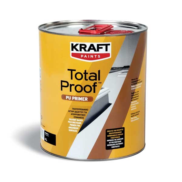 Το KRAFT TOTAL PROOF PU PRIMER είναι ένα διάφανο αστάρι πολυουρεθανικής βάσης. Παρέχει υψηλή διεισδυτικότητα και μεγάλη πρόσφυση σε απορροφητικά υποστρώματα, μεγάλη αντοχή στις μηχανικές καταπονήσεις και την τριβή. Μειώνει την απορροφητικότητα και σταθεροποιεί τα απορροφητικά υποστρώματα, όπως σκυρόδεμα, σοβά, ξύλο, γυψοσανίδες. Έχει γρήγορο στέγνωμα και βελτιώνει την απόδοση της στεγανωτικής μεμβράνης KRAFT TOTAL PROOF PU-S. Μπορεί επίσης να χρησιμοποιηθεί ως σταθεροποιητής σαθρών επιφανειών σε δάπεδα και τοιχία αλλά και ως προστατευτική διαφανής τελική επίστρωση σε δάπεδα με βαρύ φορτίο χημικών, όξινων διαλυμάτων, ελαίων, ορυκτελαίων, κλπ.